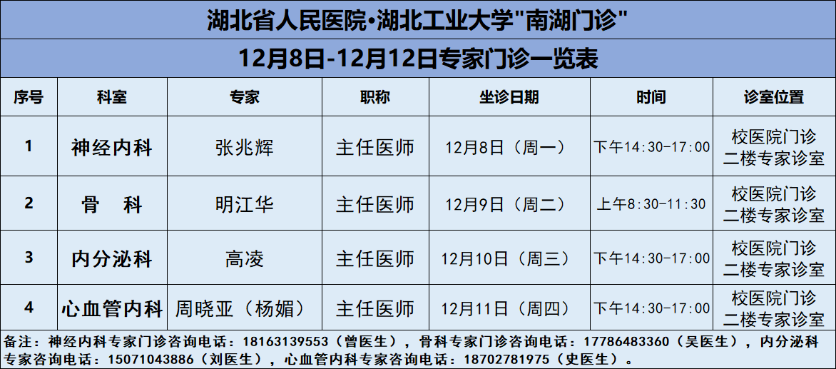 12月8日—12月12日,湖北工业大学医院将邀请湖北省人民医院知名专家——神经内科张兆辉主任、骨科明江华主任、内分泌科高凌主任、心内科周晓亚主任三位专家教授前来校医院坐诊(具体坐诊信息见下)。请广大师生、周边居民持续关注南湖门诊专家坐诊信息,如有: