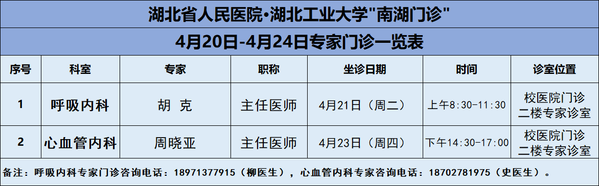 4月20日-4月24日,湖北工业大学医院将邀请湖北省人民医院知名专家——呼吸内科胡克主任、心内科周晓亚主任两位专家教授前来校医院坐诊(具体坐诊信息见下),请广大师生、周边居民持续关注南湖门诊专家坐诊信息,如有: