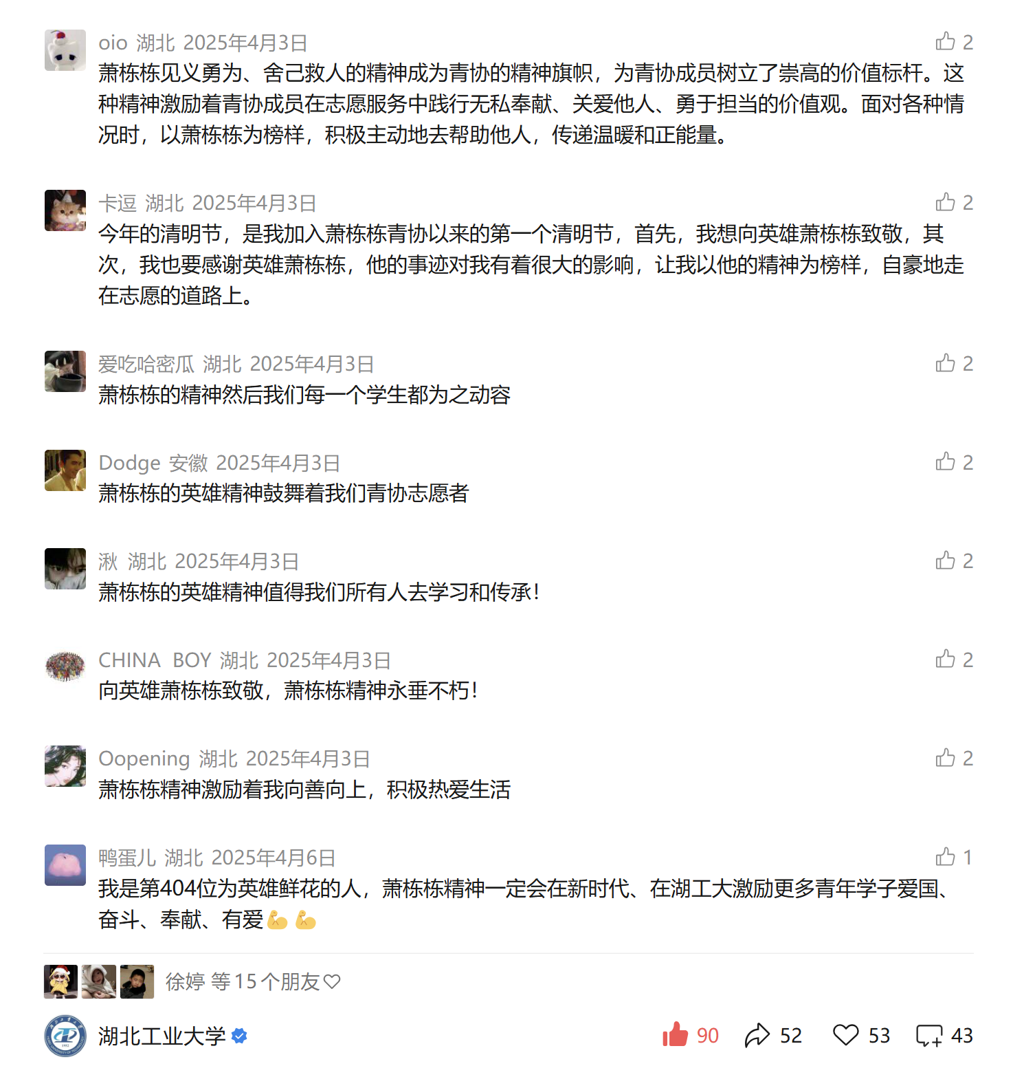 网友“鸭蛋儿”:我是第404位为英雄鲜花的人,萧栋栋精神一定会在新时代、在湖工大激励更多青年学子爱国、奋斗、奉献、有爱。