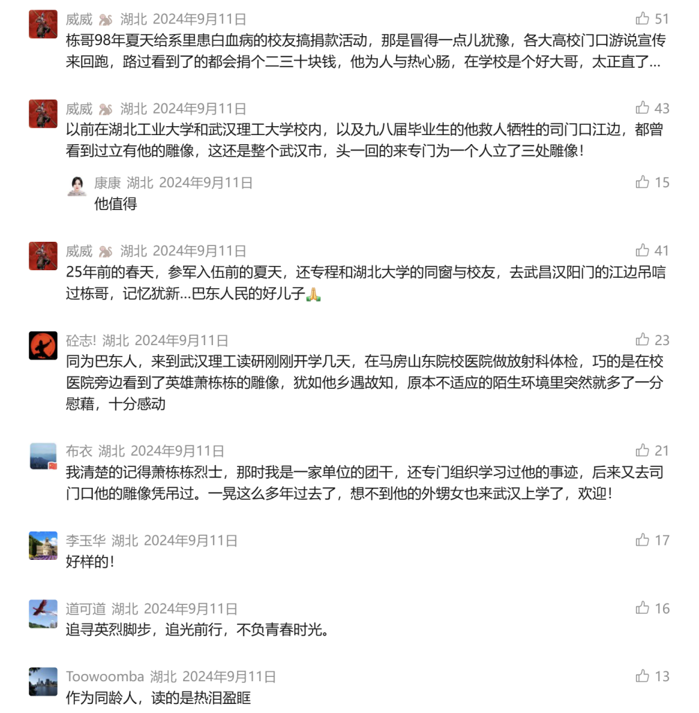 网友“布衣”:我清楚的记得萧栋栋烈士,那时我是一家单位的团干,还专门组织学习过他的事迹,后来又去司门口他的雕像凭吊过。一晃这么多年过去了,想不到他的外甥女也来武汉上学了,欢迎!