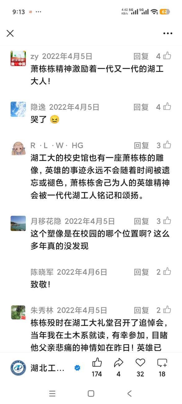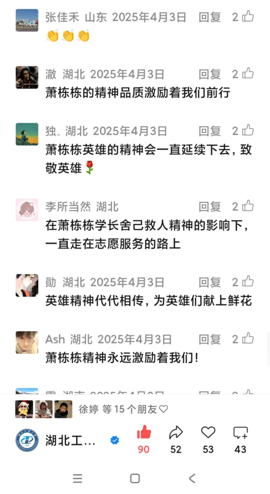 网友“R·L·W·HG”留言,“湖工大的校史馆也有一座萧栋栋的雕像,英雄的事迹永远不会随着时间被遗忘或褪色,萧栋栋舍己为人的英雄精神会被一代代湖工人铭记和颂扬。”