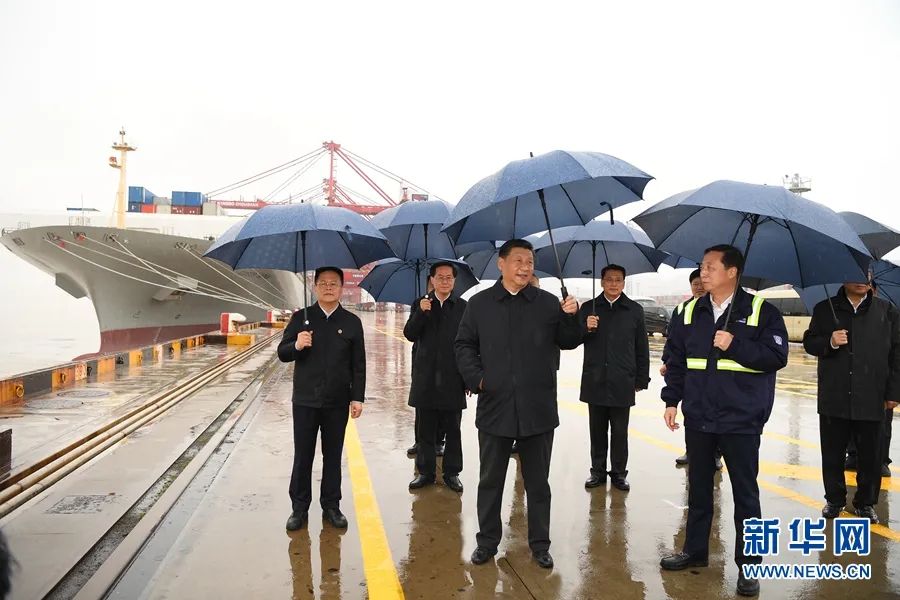 随后,习近平乘车来到穿山港区2号集装箱泊位,冒雨察看了码头现场集装箱作业场景,了解港口作业情况。习近平强调,港口是基础性、枢纽性设施,是经济发展的重要支撑。宁波舟山港在共建“一带一路”、长江经济带发展、长三角一体化发展等国家战略中具有重要地位,是“硬核”力量。要坚持一流标准,把港口建设好、管理好,努力打造世界一流强港,为国家发展作出更大贡献。