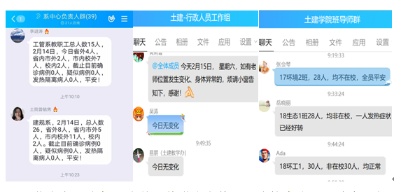 为了解全院师生动态情况,学院建立了“学院-值班人员-系主任-教师”和“学院-学工办-辅导员-班导师-学生信息员”构成的两层信息畅通体系。值班的行政人员和辅导员每日在线上仔细地清点着各系和各班的数据,确保不漏一人,不差一尺。他们克服诸多困难,不辞劳苦,用细心的工作及时准确汇集更新着第一手信息,用踏实有力的行动默默守护着全院近3000师生员工的平安。