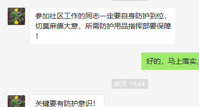 校党委书记、校新冠肺炎疫情防控领导小组组长李克勤高度关注党员干部下沉社区志愿服务工作,多次对志愿服务工作作出指示提出要求,同时也通过微信叮嘱参加社区工作的同志,要有防护意识,一定要自身防护到位,切莫麻痹大意,所需防护用品指挥部要保障。