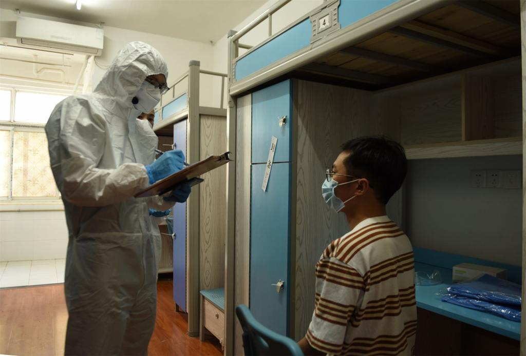 在学生公寓,学生进入宿舍均测量体温,严格落实晨午晚检制度,各学院实行“日报告”“零报告”制度。演练中,对入住宿舍后的体温异常者,立即告知宿舍长,通知辅导员。辅导员将发热学生带至宿舍应急观察室,就地隔离;校医院医师对发热学生进行测温和问诊体格检查,要求学生更换N95口罩,判断为高度疑似病例,按发热人员应急流程送定点医院发热门诊进行诊治。保卫处安排人员对寝室同层区域进行管控,学工部安排宿管人员对学生宿舍等频繁活动区域进行现场消杀和污染物处置。