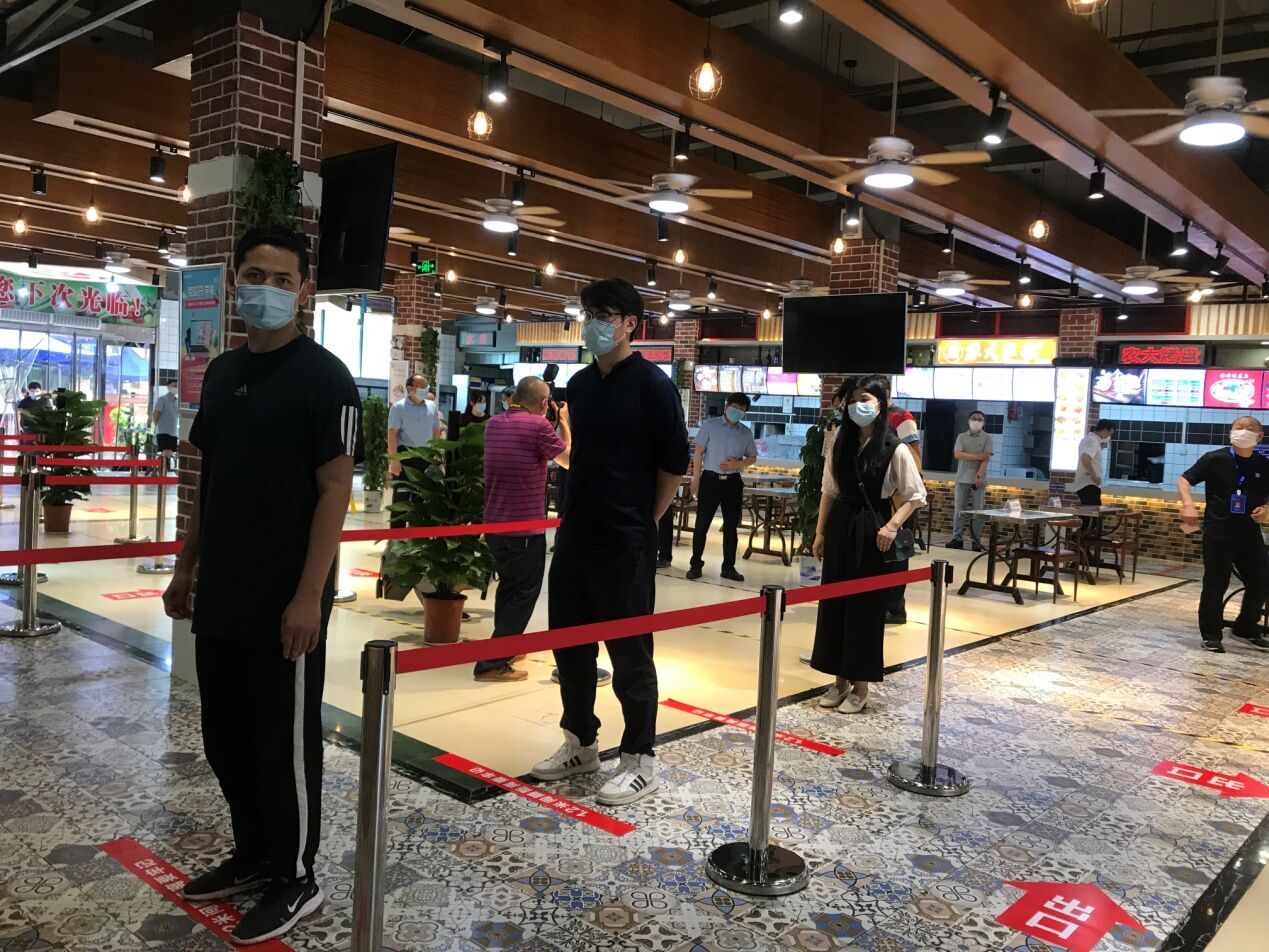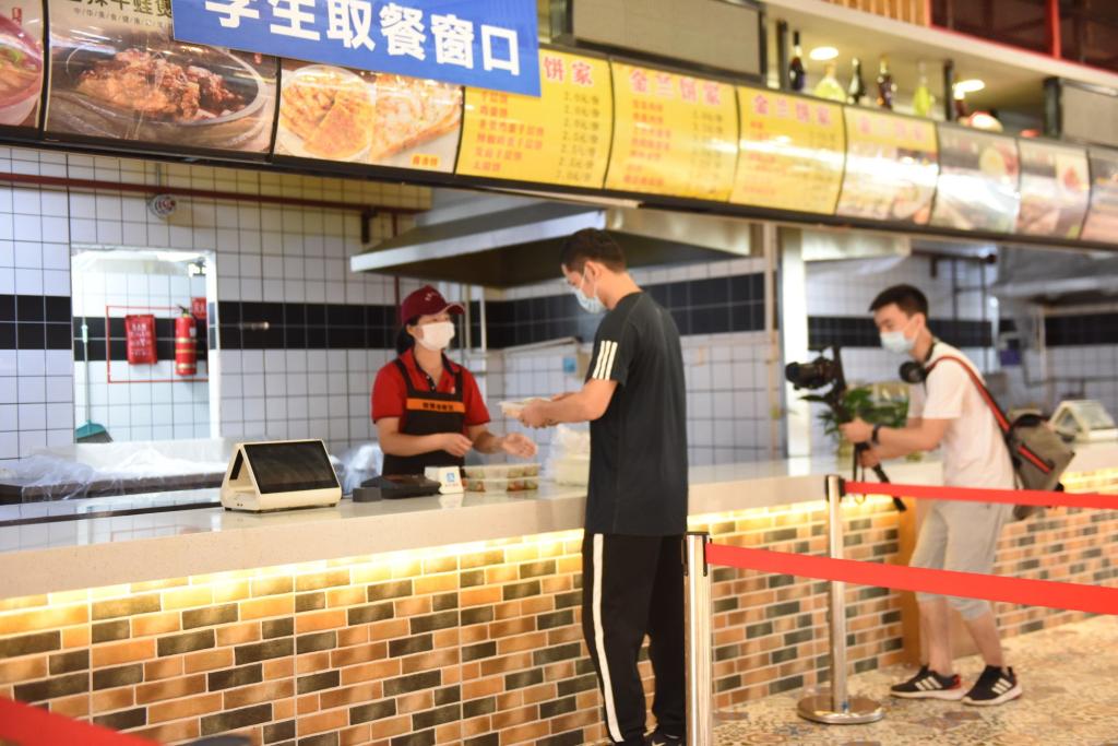 在北区食堂,就餐环境整洁、安全、有序,室外已经安装好洗手池、门口铺设消毒垫。进入食堂前,进行红外线门禁系统测温。实行错峰就餐,确保“一人一具、一用一消毒”原则。学生要餐前餐后洗手,提倡自带餐具,取餐即取即走;排队领餐时学生之间要保持1.2米以上距离,如需在食堂就餐,一人一桌安全就餐,或各自把餐盘放到有挡板的餐桌上就坐,相互不要交流,就餐结束尽快戴好口罩离开食堂。对于体温检测异常者,立即带至指定观察点,按应急流程处置。