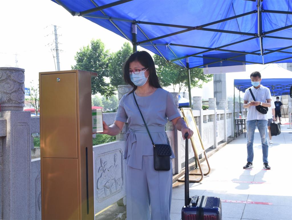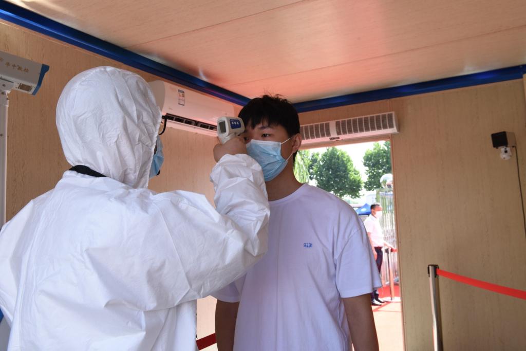 在校大门口,开辟返校学生专用通道。参与演练的志愿者,手提行李箱,模拟学生返校。保卫处及时疏导车辆,禁止外来车辆、家长等外来人员进校,引导学生有序按指定专属通道排队,前后保持1.2米距离,进行行李物品消毒、身份核查、体温检测等环节。对于通过红外体温检测仪出现报警的体温异常者,保卫处工作人员用额温枪再次测温,体温超过37.3℃,通过专用通道将其带到校大门临时应急观察区,并通知校医院。校医院医师复查体温两次,通过初筛,调查有无流行病学史,怀疑为高度疑似病例者,将相关情况报学校防疫工作领导小组办公室,联系社区按发热人员应急流程送省定点医院发热门诊进行诊治。