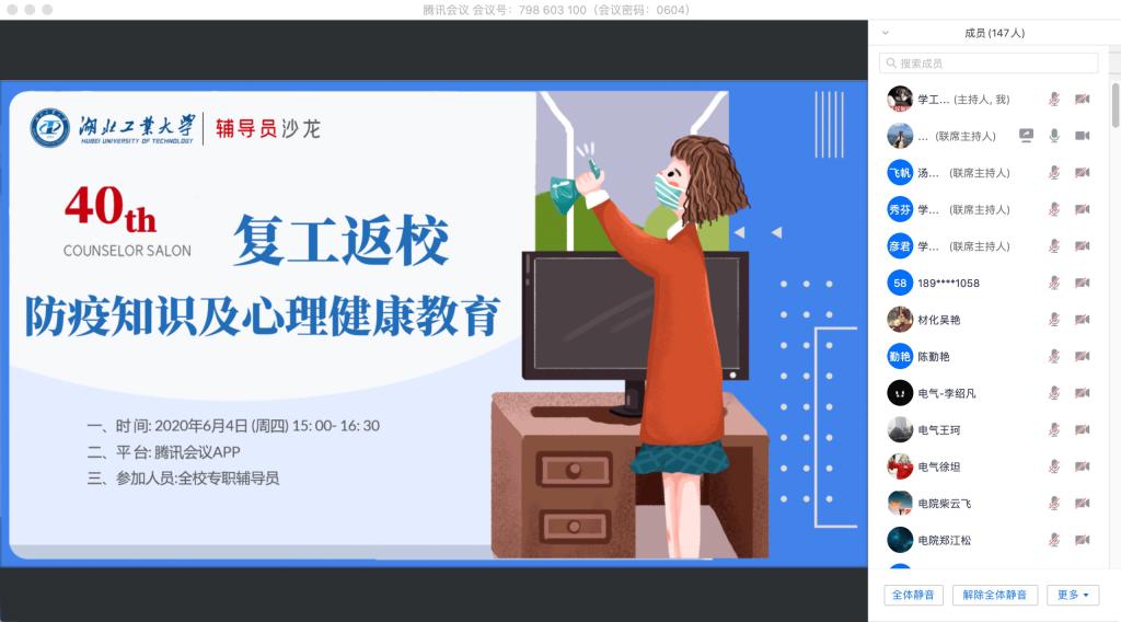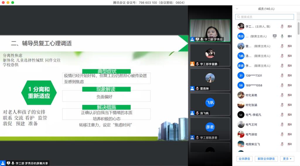 6月4日下午,为进一步贯彻落实学校防控工作领导小组关于毕业生返校工作的安排部署以及上好“开学第一课”的工作指示,学校举办了以“复工返校防疫知识及心理健康教育专题培训”为主题的线上辅导员沙龙。本次沙龙由校医院和学工部联合举办,校医院健康导师团,各学院党委(党总支)副书记,全体本科生、研究生、国际学生、工程技术学院辅导员和校心理健康教育与咨询中心专职教师等共计140余人参加了本次活动。