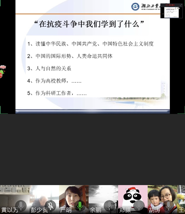唐良辉(土建学院党委书记):作为一个教育工作者,在“停课不停教、停课不停学”网络视频教学中,我们的教师更加注重了课程思政,注重了教书育人,结合我们共同经历的抗击新冠肺炎疫情,对青年学生讲中国故事、讲战疫故事,讲共产党员不忘初心、牢记使命。