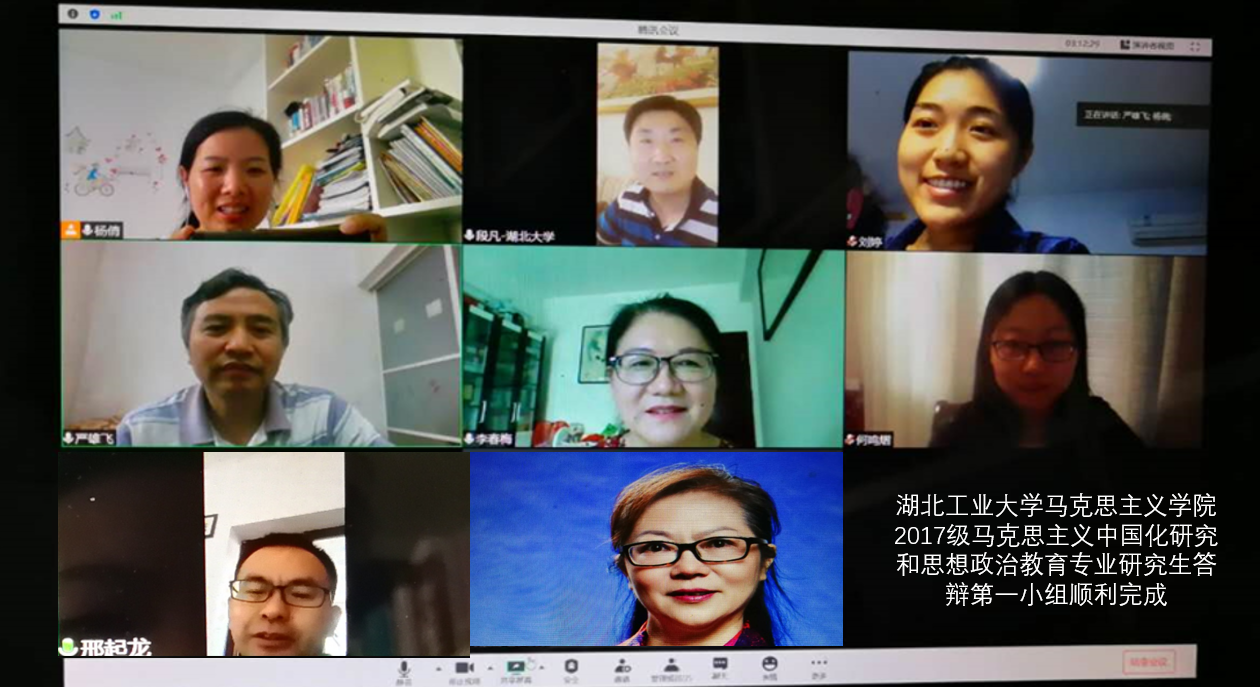 受新冠肺炎疫情影响,今年有着不一样的毕业季,在学校、学院、老师们和同学们的共同努力下,湖北工业大学马克思主义学院根据实际情况,不断创新工作模式,精心准备,有力保障了学院研究生毕业班同学们“研究不断,论文不停,质量不降”。6月13日下午,通过“云端”视频会议,第一批7位2020届毕业生如期举行了毕业论文答辩。