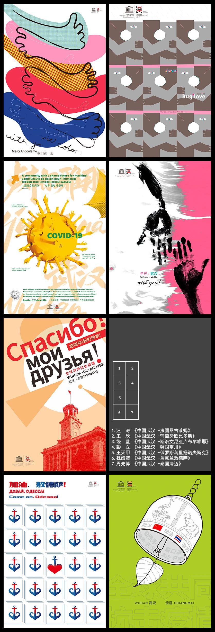 学院积极参与联合国设计之都网络城市设计交流活动。联合武汉设计产业促进中心、湖北省包装联合会设计委员会和武汉市工业设计行业协会共同面向全社会发起“战疫情,武汉能!”2020抗击新冠肺炎公益宣传设计全球征集活动,28天时间收到来自海内外的各类作品近7600余幅。与此同时,汪涛、王欣、饶鉴、彭立、王天甲、魏靖靖、周先博七位老师受邀创作回应联合国教科文组织文学之都等城市祝福武汉的海报设计。