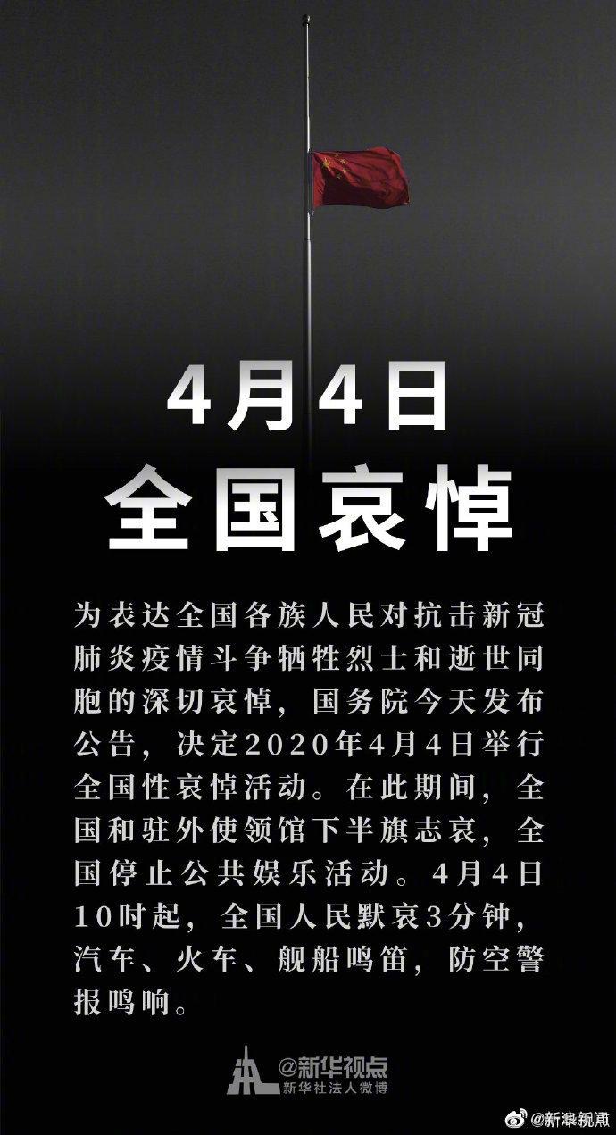 为表达全国各族人民对抗击新冠肺炎疫情斗争牺牲烈士和逝世同胞的深切哀悼,国务院决定,2020年4月4日举行全国性哀悼活动。在此期间,全国和驻外使领馆下半旗志哀,全国停止公共娱乐活动。4月4日10时起,全国人民默哀3分钟,汽车、火车、舰船鸣笛,防空警报鸣响。