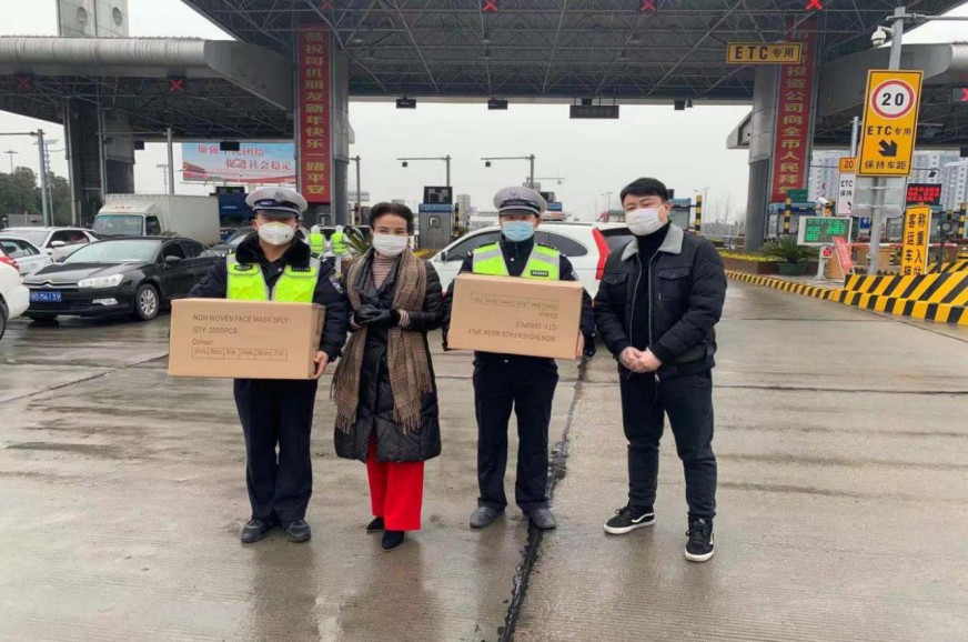 肖航(右一)向湖北省高速公路警察总队三支队捐赠3000只口罩