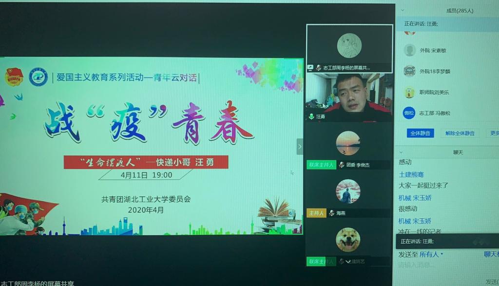 4月11日晚,湖北工业大学2020爱国主义教育系列活动“青年云对话--—战‘疫’青春”在线上成功举办。活动邀请被人民日报誉为“生命摆渡人”的“最美快递员”汪勇走进直播间在线为300余名师生及家长讲授他的抗“疫”经历,分享青春故事。校长刘德富、副校长龚发云出席本次活动。