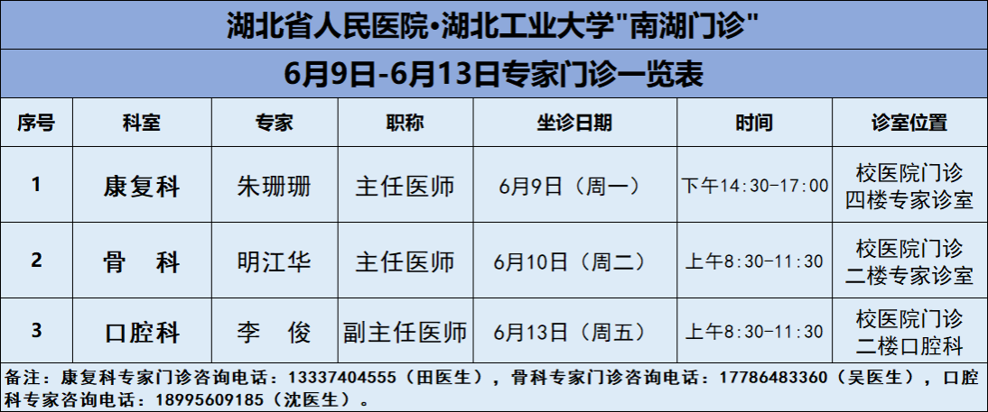 6月9日-6月13日,湖北工业大学医院将邀请湖北省人民医院知名专家——康复科朱珊珊主任、骨科明江华主任、口腔科李俊副主任三位专家教授前来校医院坐诊(具体坐诊信息见下),请广大师生、周边居民持续关注南湖门诊专家坐诊信息,如有:
