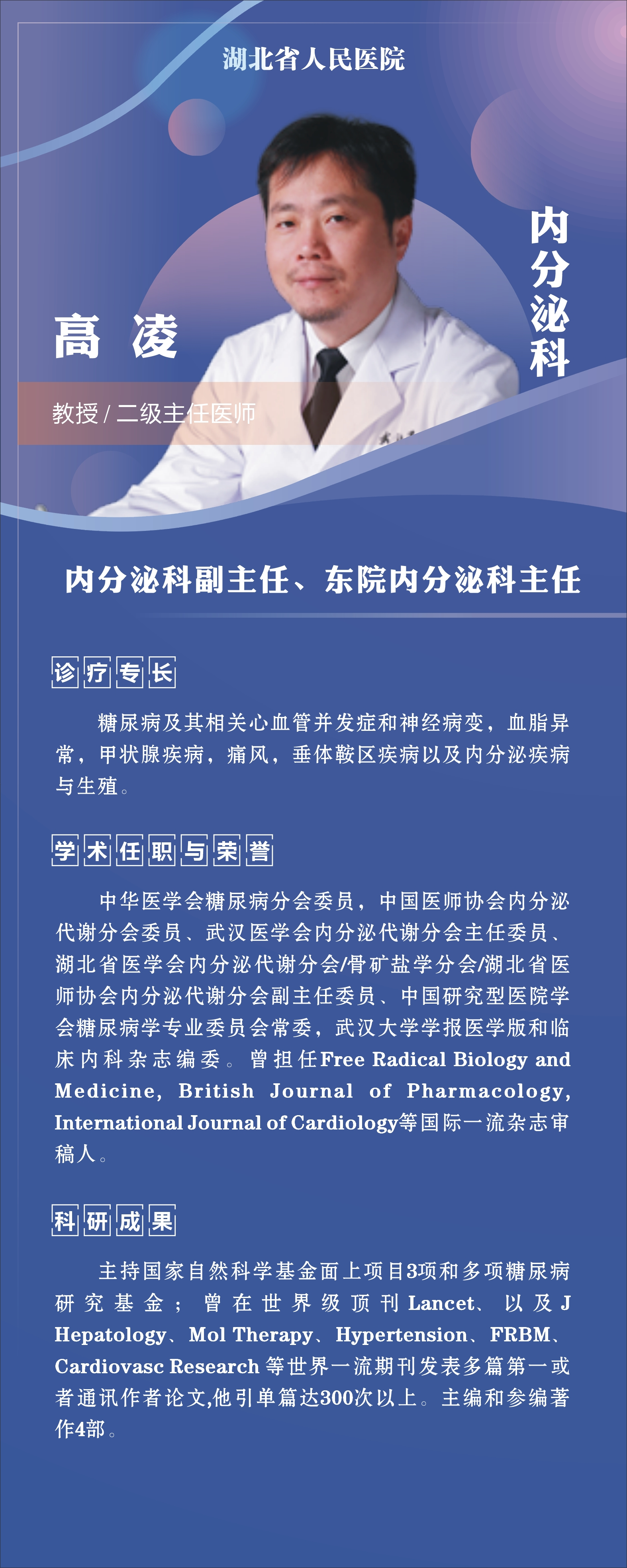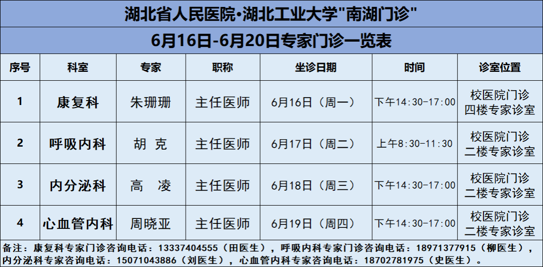 6月16日-6月20日,湖北工业大学医院将邀请湖北省人民医院知名专家——康复科朱珊珊主任、呼吸内科胡克主任、内分泌科高凌主任、心血管内科周晓亚主任四位专家教授前来校医院坐诊(具体坐诊信息见下),请广大师生、周边居民持续关注南湖门诊专家坐诊信息,如有: