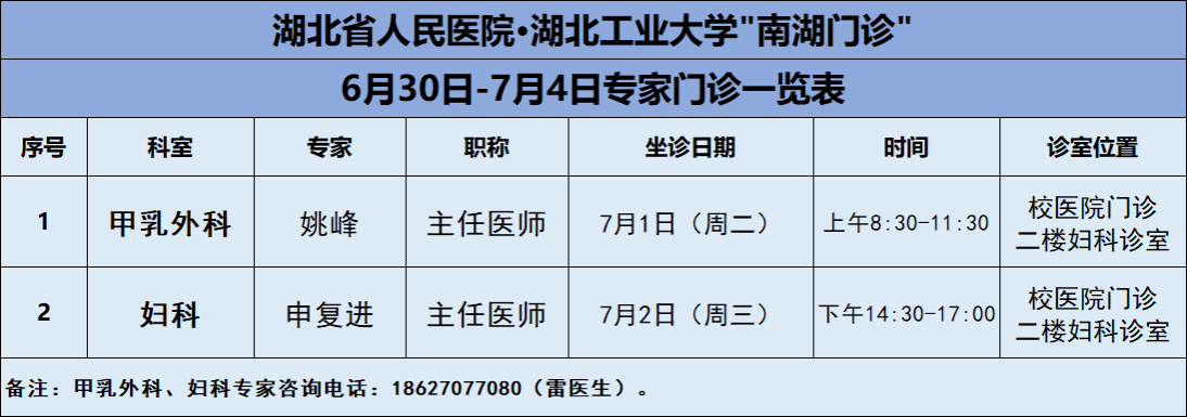 6月30日-7月4日,湖北工业大学医院将邀请湖北省人民医院知名专家——甲乳外科姚峰主任、妇科申复进主任两位专家教授前来校医院坐诊(具体坐诊信息见下),请广大师生、周边居民持续关注南湖门诊专家坐诊信息,如有: