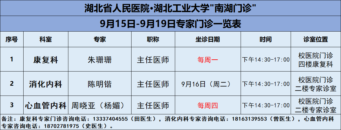 9月15日-9月19日,湖北工业大学医院将邀请湖北省人民医院知名专家——康复科朱珊珊主任、消化内科陈明锴主任、心内科周晓亚主任三位专家教授前来校医院坐诊(具体坐诊信息见下),请广大师生、周边居民持续关注南湖门诊专家坐诊信息,如有: