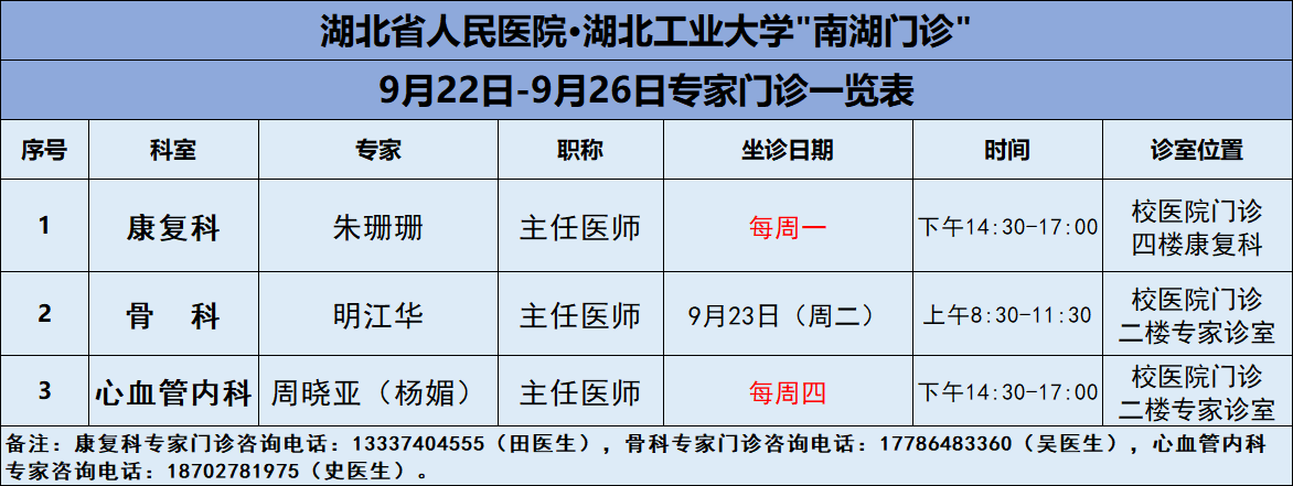 9月22日-9月26日,湖北工业大学医院将邀请湖北省人民医院知名专家——康复科朱珊珊主任、骨科明江华主任、心内科周晓亚三位专家教授前来校医院坐诊(具体坐诊信息见下),请广大师生、周边居民持续关注南湖门诊专家坐诊信息,如有:
