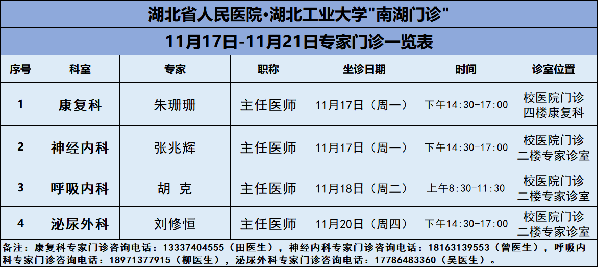 11月17日-11月21日,湖北工业大学医院将邀请湖北省人民医院知名专家——康复科朱珊珊主任、神经内科张兆辉、呼吸内科胡克主任、泌尿外科刘修恒四位专家教授前来校医院坐诊(具体坐诊信息见下),请广大师生、周边居民持续关注南湖门诊专家坐诊信息,如有: