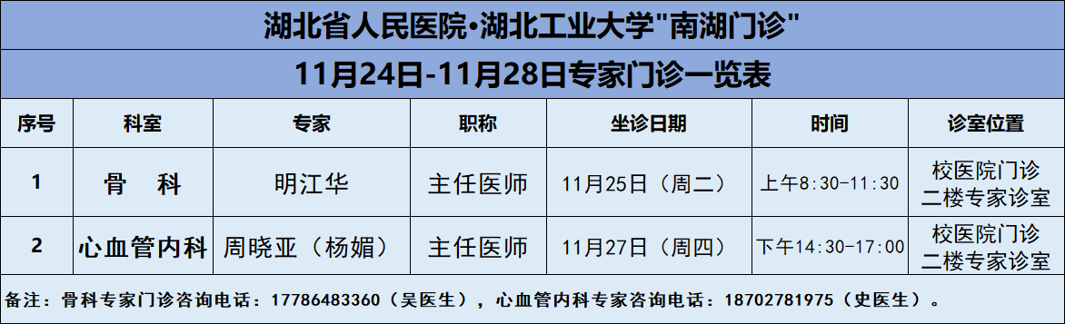 11月24日——11月28日,湖北工业大学医院将邀请湖北省人民医院知名专家——骨科明江华主任、心内科周晓亚主任两位专家教授前来校医院坐诊(具体坐诊信息见下)。请广大师生、周边居民持续关注南湖门诊专家坐诊信息,如有: