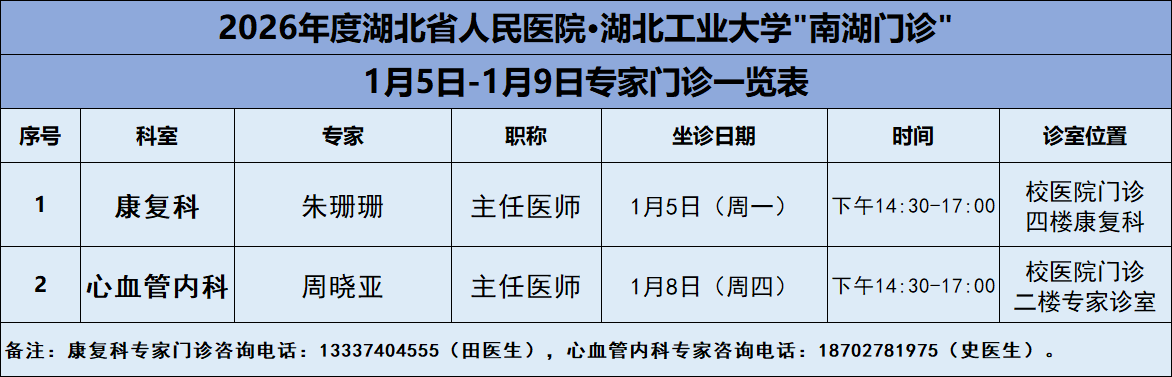 2026年1月5日—1月9日,湖北工业大学医院将邀请湖北省人民医院知名专家——康复科朱珊珊主任、心内科周晓亚主任两位专家教授前来校医院坐诊(具体坐诊信息见下)。请广大师生、周边居民持续关注南湖门诊专家坐诊信息,如有: