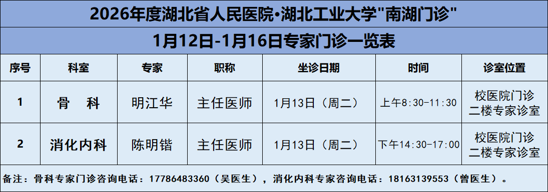 2026年1月12日—1月16日,湖北工业大学医院将邀请湖北省人民医院知名专家——骨科明江华主任、消化内科陈明锴主任两位专家教授前来校医院坐诊(具体坐诊信息见下)。请广大师生、周边居民持续关注南湖门诊专家坐诊信息,如有: