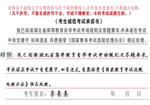 1.落实笔迹信息采集要求。考生应在答题卡指定区域完整抄写《考生诚信考试承诺书》(抄写样例如下图),凡不抄写、不签名或抄写不全,字迹不清晰者,该科考试成绩无效。毕业时省教育考试院将对每张答题卡上的《考生诚信考试承诺书》笔迹进行复核,凡笔迹不一致、经鉴定为代考的,将根据《国家教育考试违规处理办法》作出成绩作废、延迟毕业、记入国家教育考试诚信档案等处理。