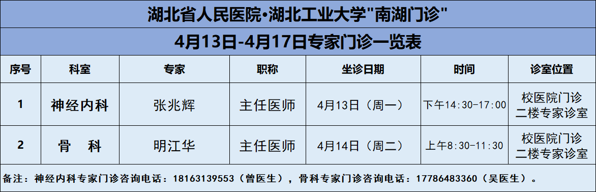 4月13日-4月17日,湖北工业大学医院将邀请湖北省人民医院知名专家——骨科明江华主任、神经内科张兆辉主任两位专家教授前来校医院坐诊(具体坐诊信息见下),请广大师生、周边居民持续关注南湖门诊专家坐诊信息,如有: