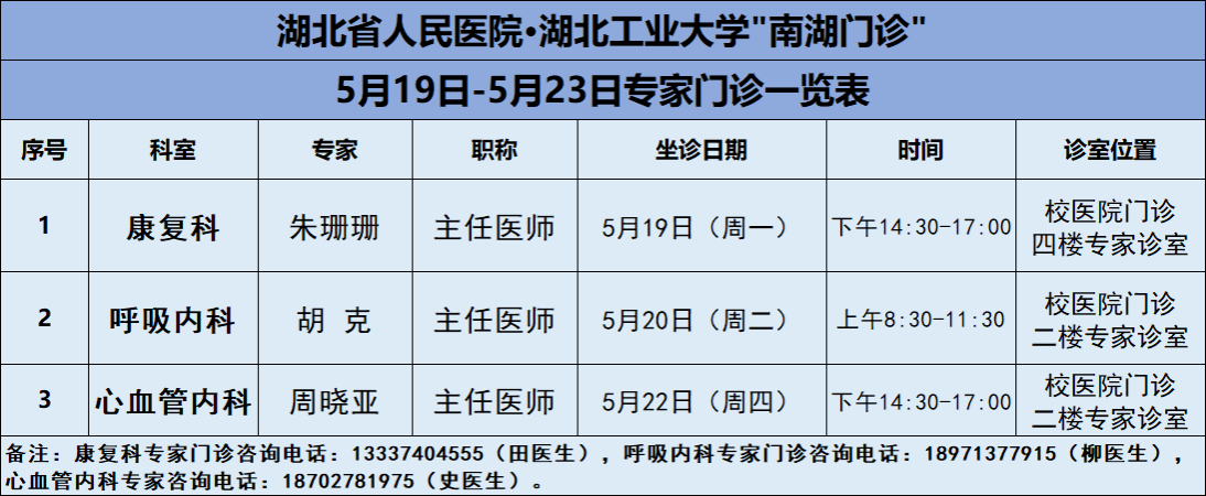 5月19日-23日,湖北工业大学医院将邀请湖北省人民医院知名专家——康复科朱珊珊主任、呼吸内科胡克主任、心内科周晓亚主任三位专家教授前来校医院坐诊(具体坐诊信息见下),请广大师生、周边居民持续关注南湖门诊专家坐诊信息,如有: