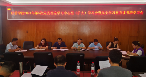 7月8日,经管学院2021年第6次党委理论学习中心组(扩大)学习会暨党史学习教育读书班学习会在文科楼810会议室召开。学院党委理论学习中心组成员和党支部书记参加了学习会。