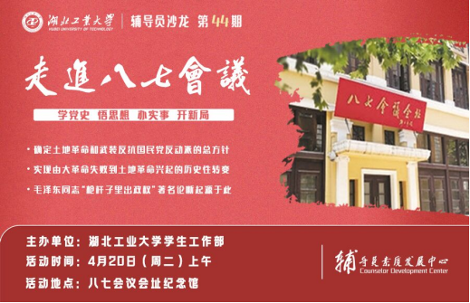 4月20日上午,为进一步坚定学校学生工作队伍理想信念,牢记初心使命,将党史学习教育成效转化为接续奋斗的精神动力,学校以“走进八七会议”为主题,组织学工队伍赴“八七会议”会址纪念馆开展党史学习教育现场教学活动暨第44期辅导员沙龙。校党委常委、副校长龚发云全程参与本次活动。