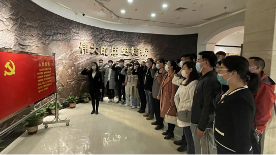 在纪念馆一楼大厅,全体同志面对鲜艳的中国共产党党旗,举起右手、握紧拳头,重温入党誓词。