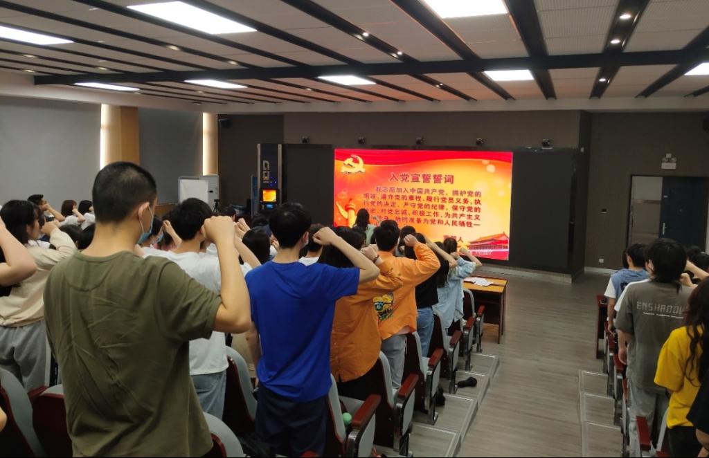 观看完影片后,在生食学院生工党支部负责人的领誓下,在场的全体同学一起高举右拳,宣读入党誓词。