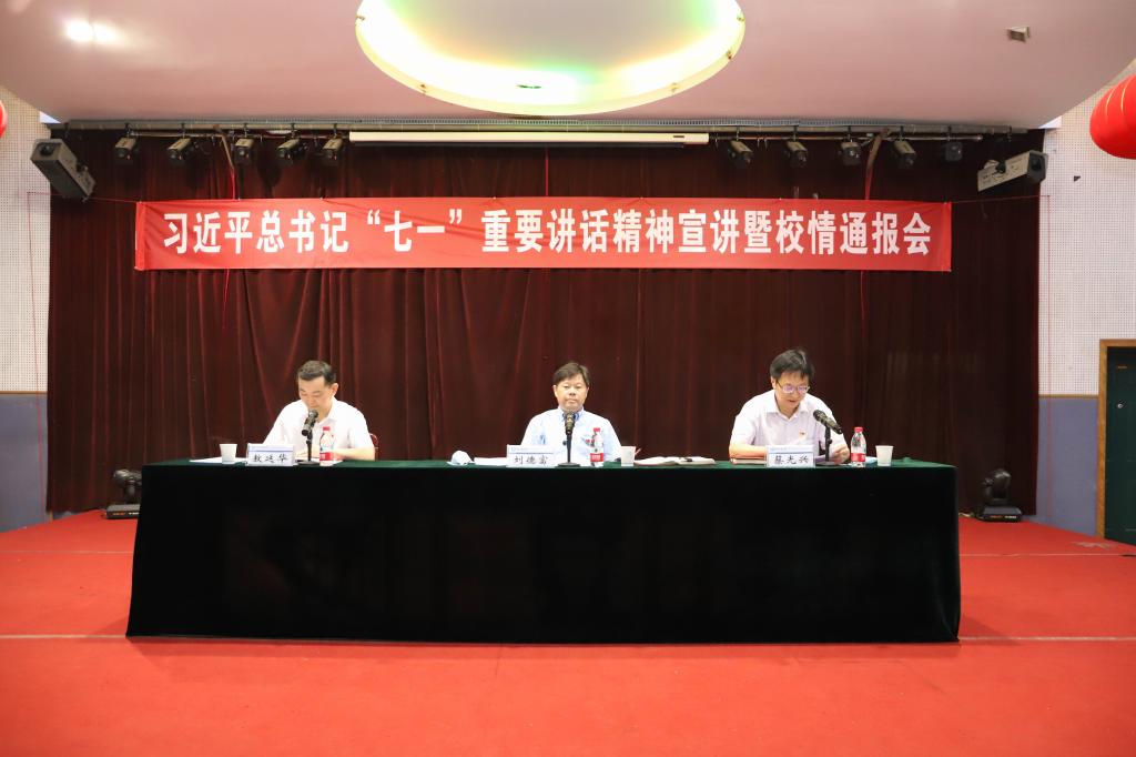 根据学校党委工作安排,7月14日,学校在南区教职工活动中心一楼综艺厅召开会议,校党委书记刘德富和校党委常委、宣传部部长敖廷华分别为离退休同志作校情通报和习近平总书记“七一”重要讲话精神宣讲。会议由校党委副书记蔡光兴主持。