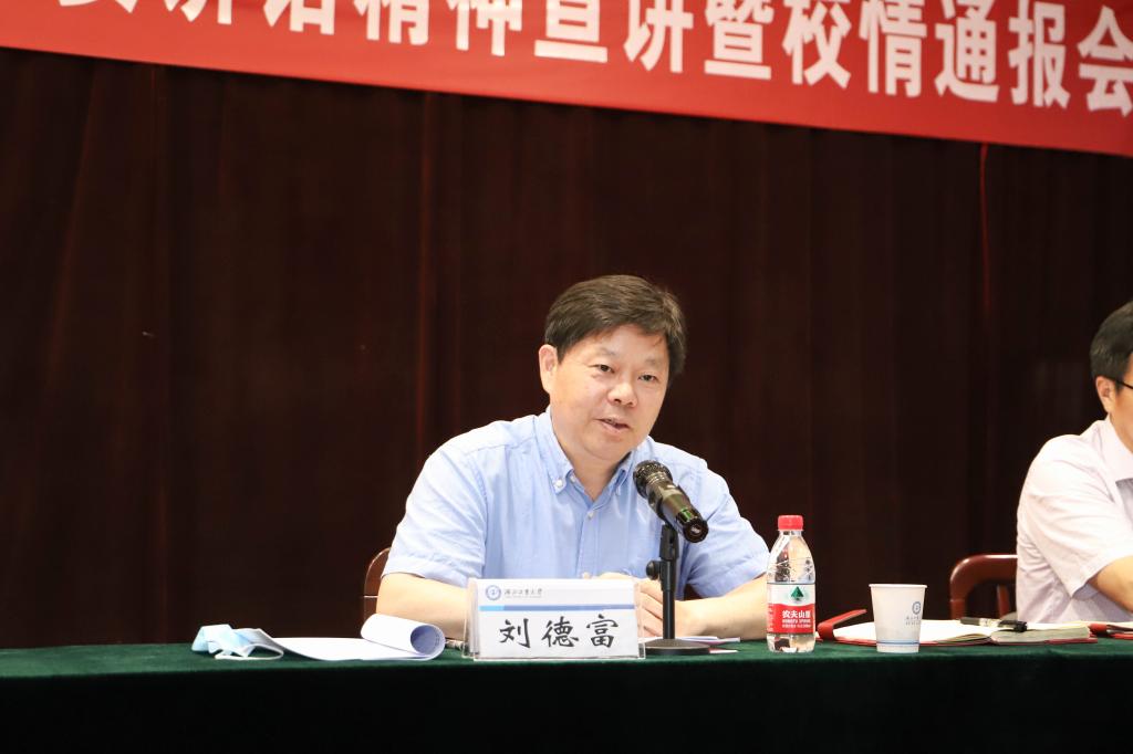 刘德富向离退休同志通报了学校第三次党代会精神。他从第三次党代会召开的背景、确立的主题、主要内容、主要成果、成绩及不足、发展经验、发展蓝图及举措等七个方面传达了党代会精神。他重点介绍了学校将实施的“三步走”战略及“四个聚焦”“四个融合”“四大工程”和“四个走在前列”的发展思路。他还介绍了全校师生为实现学校第三次党代会确立的宏伟蓝图要重点做好的“六篇文章”。
