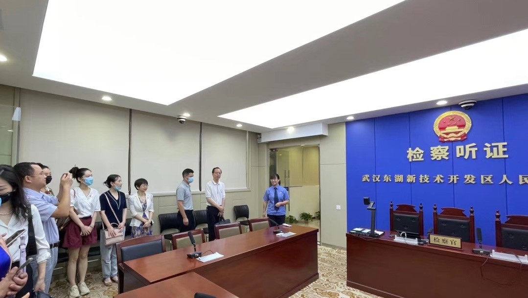 两个支部党员教师来到东湖新技术开发区人民检察院,东湖新技术开发区人民检察院分党组书记、检察长刘桃荣对马克思主义学院两个支部教师的到来表示欢迎,并带领大家依次参观了12309检察服务中心、远程视频接访室、检察听证室、案件管理中心、未成年人检察工作室、检察文化长廊。马克思主义学院教师党员现场听取了东湖新技术开发区人民检察院关于检察工作流程、智慧司法、未成年人特殊检察制度、检察文化建设的讲解,从检察职能到具体工作流程,再到制度建设和文化建设,细致的讲解,深化了马克思主义学院教师党员对检察机关职能及工作的认识。