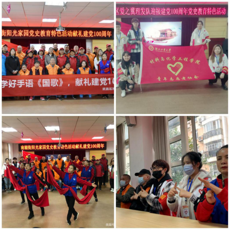 此前,4月1日上午材化青协“青凝”团队的学生志愿者们走进武汉市华锦社区,参加由武昌区残联主办,武昌区聋协、华锦社区及南湖街阳光家园承办的残疾人党史教育特色活动——残疾人手语“唱”国歌,和“爱之翼”残疾人理发队成员们带领南湖街阳光家园社区的残疾人观看了党史记录短片《奋斗百年路,启航新征程》,一起感悟党的百年奋斗史,一同整齐庄重地使用国家通用手语“演唱”国歌,最后共同表演了节目《没有共产党就没有新中国》,现场载歌载舞,群众反响热烈。