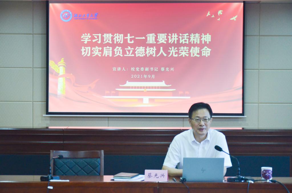 蔡光兴以《学习贯彻“七一”重要讲话精神,切实肩负立德树人光荣使命》为主题,通过准确把握习近平总书记“七一”重要讲话重大意义、深入领会习近平总书记“七一”重要讲话新思想新观点新要求、贯彻落实习近平总书记“七一”重要讲话精神,牢记为党育人为国育才初心使命三个方面对习近平总书记“七一”重要讲话精神进行了深入阐述。