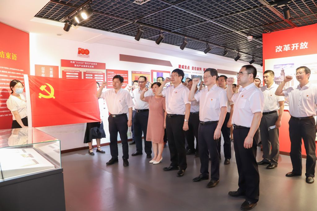 参观结束后,刘德富带领全体党员同志,面对党旗列队肃立,重温入党誓词。