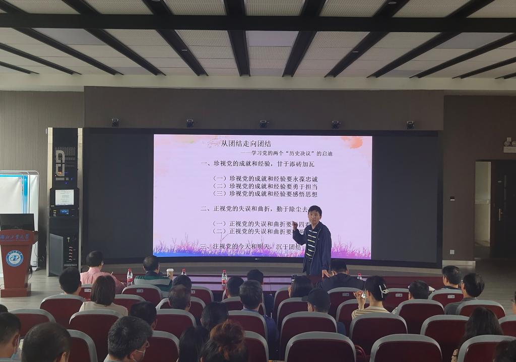 王文斌以“从团结走向团结”为题,解读了《关于若干历史问题的决议》和《关于建国以来党的若干历史问题的决议》这两份重要历史文件,两份历史决议是党中央在非凡政治魄力和敢于自我批评的勇气下对党的历史科学、系统、客观的总结,是被证明了的正确的结论,是各类党史著作和学术研究关于党史相关人物、事件、路线评价和结论的重要依据。王文斌阐释了“从团结走向团结”题目的由来,解读了两份文件出台的历史特点,讲述两份决议前后修改七次之多的历史故事以及改革文本时体现的高度负责的精神。梳理两个决议的基本内容以后,他谈了三点学习体会:一是要珍视党的成就和经验,作为思政课教师甘于添砖加瓦;二是要正视党的失误和曲折,勤于除尘去灰;三是要注视党的今天和明天,沉于团结一心。