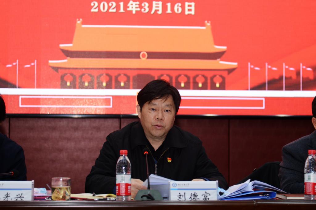 刘德富就深入贯彻落实习近平总书记在党史学习教育动员大会上的重要讲话精神,高标准高质量地开展好学校党史学习教育,提出三点意见:一是坚定不移把思想统一到习近平总书记重要讲话精神上来,自觉增强党史学习教育的思想自觉、政治自觉、行动自觉,要充分认识开展党史学习教育的重大意义,准确把握“学史明理、学史增信、学史崇德、学史力行,学党史、悟思想、办实事、开新局”总体要求,突出“六个进一步”的重点内容。二是坚定不移贯彻党中央决策部署和省委要求,高标准高质量完成党史学习教育各项目标任务,自觉增强学习教育积极性、主动性、创造性,要准确把握目标任务,认真落实工作安排,抓好专题学习、加强政治引领、组织专题培训、“我为群众办实事”实践活动、召开专题组织生活会等专题活动。三是坚定不移地将党史学习教育成效转化为学校改革创新发展的强大动力,推进学校“十四五”各项事业开好局、起好步、见实效,要加强组织领导,把握正确导向,科学统筹安排,将学习教育与开好第三次党代会相结合,与谋划学校“十四五”规划相结合,与落实学校2021年重点工作相结合,通过党史学习教育,凝聚强大动力推动学校各项事业高质量发展,以优异成绩庆祝中国共产党成立100周年。