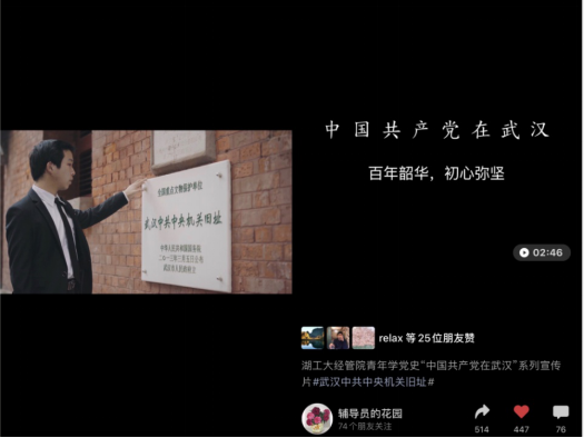 该系列微党课的第一组视频《中共中央机关旧址》于4月20日通过微信视频号“辅导员的花园”首推,当天就达到500多的转发量和400多的点赞量。有的学生在评论区留言道:“革命历史提供丰厚滋养,从党史中明确方向坚定信念,激励自己凝聚力量!” “向身边的优秀共产党员学习”。有校友留言道:“武汉是一座英雄的城市,学生党员讲武汉党史让我很好的了解了在这片土地上的红色故事,作为曾经在武汉求学的学子,我由衷地感到骄傲。”
