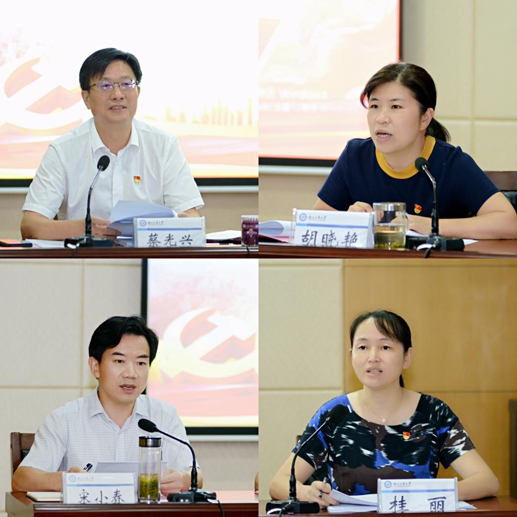 校党委副书记、校长彭育园强调,深入学习贯彻“七一”重要讲话精神、习近平总书记重要讲话、重要回信精神、党的组织工作条例及中央巡视反馈意见,要抓住四个重点。第一,要加强“七一”重要讲话精神研究阐释。学校党建和思想政治工作队伍、相关学科学术骨干要围绕学习七一”重要讲话精神,撰写理论文章,努力产出有深度有影响的理论成果,不断提升学习成效。第二,要牢固树立“工作只有进行时、没有完成时”观念,对照中央巡视向教育部和中管高校反馈意见,以更高的标准扎实抓好各项工作,不留空白。第三,要把“大学是一个基础党组织”观念摆在第一位,机关部门要加强工作作风建设,坚决落实党委决策决议,强化为学院服务、为师生服务的意识;学院党委在加强党的建设、强化政治保障的同时,要坚持问题导向、目标导向,加强对学院工作的全面领导,支持和保障学院教学、科研各项任务的完成。第四,要强化教师队伍立德树人的主体地位,加强教师队伍建设,积极总结典型经验,加强榜样培养和选树。