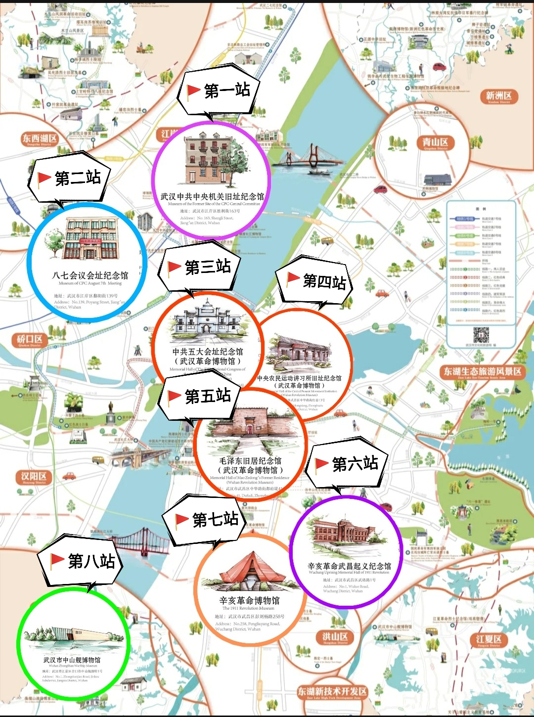 “这张红色地图,共设置八站,涵盖了武汉8处爱国主义教育基地,以武汉中共中央机关旧址纪念馆为出发点,纪念馆以复原陈列的方式再现了1926年9月—1927年10月期间的历史”,大三预备党员王世龙同学介绍说。“设计这个地图,是想在纪念建党百年华诞之际,我们也通过行走一段‘小长征’,身临其境地感受中共中央领导的波澜壮阔的革命斗争以及中国共产党探索中国革命道路的艰难历程,从而进一步弘扬伟大长征精神,践行初心与使命。”