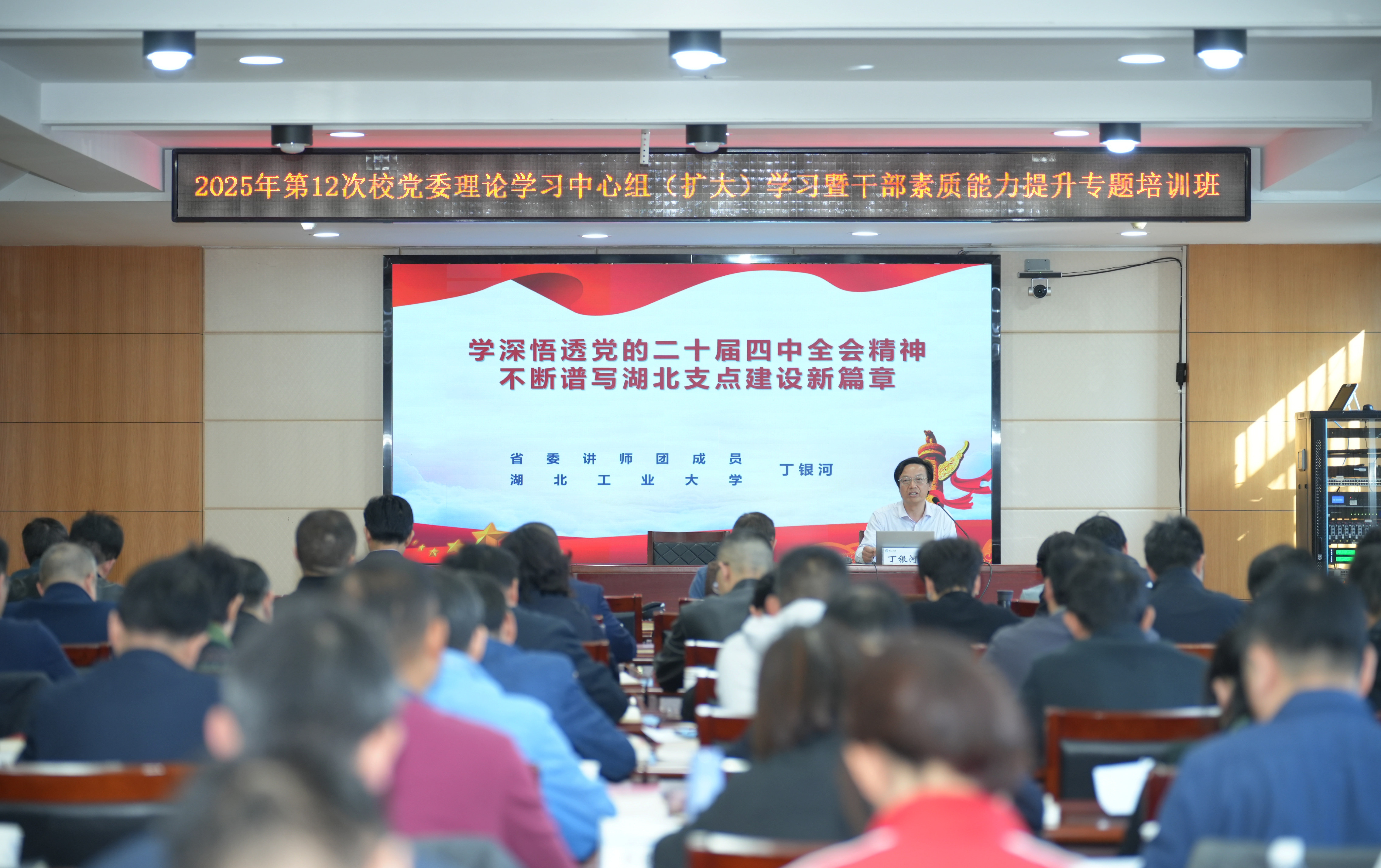 11月13日下午,学校举行2025年第12次校党委理论学习中心组(扩大)学习暨干部素质能力提升专题培训班,深入学习领会党的二十届四中全会精神。省委讲师团成员、马克思主义学院院长丁银河应邀作专题报告。校党委书记彭育园主持会议,在家校领导参加学习。