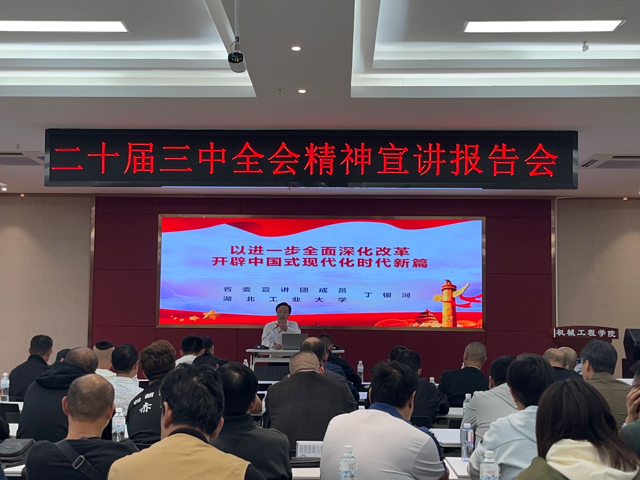 11月11日下午,省委宣讲团成员、学校马克思主义学院院长丁银河教授为后勤管理处全体干部职工宣讲党的二十届三中全会精神。后勤党总支书记韦光辉主持报告会。