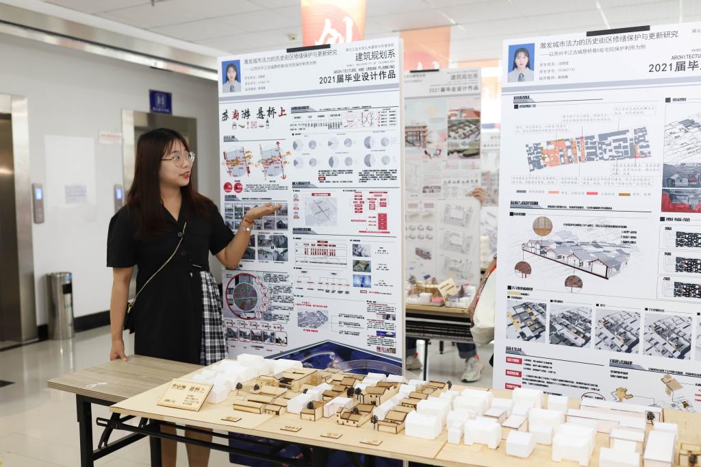 设计展上,作品形式多样,创新成为一大亮点。悬桥巷是苏州市古城东部的一条街巷,巷内多名人故居。建筑规划系沈晓莹的设计“苏尚游·悬桥上”在复原与修缮苏州五处清代名人古宅的基础上,提出了数字文化创意园区的想法。她介绍:“在依据原有风貌考证,复原残损部位的同时,我们增加了城市瞭望台,可以从这里俯瞰苏州古城,增加了空间的趣味性。设计中还增加了博物厅、周末集市、动漫游戏设计工坊等场所,引入游戏、文创等新业态,吸引更多高校创业者和年轻人,从而激发苏州古城悬桥巷的街区活力。”该院副院长黄艳雁评价:“在这个设计中,建筑是历史的,功能是时尚的,既是在传承历史文化,也是在发掘现代更时尚的产业。”