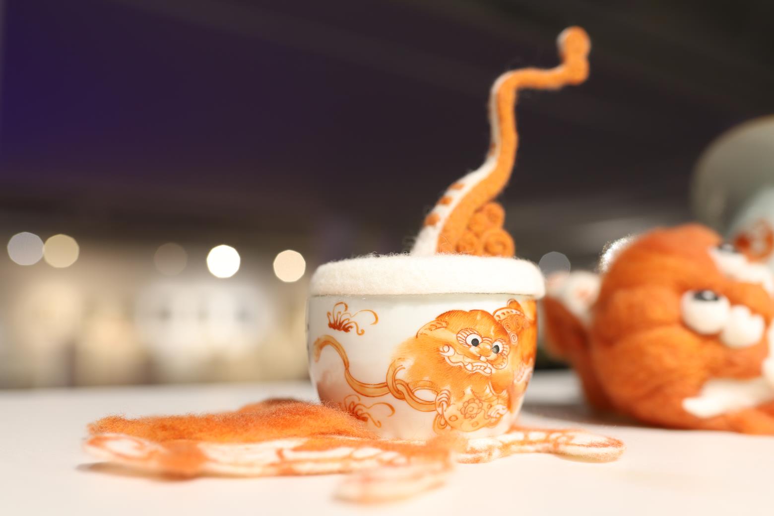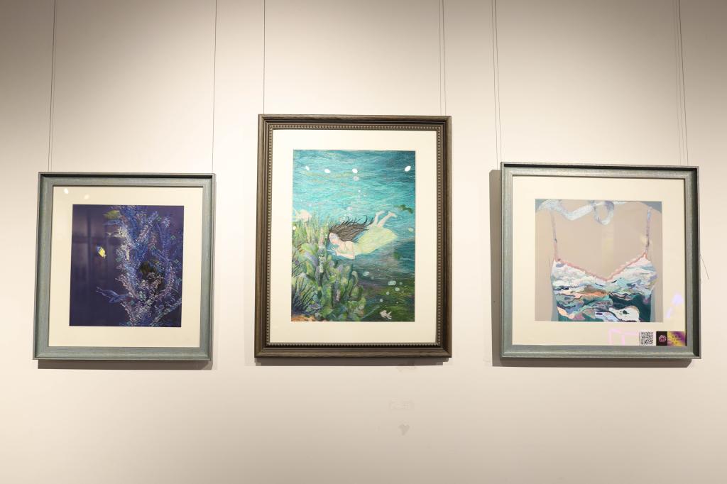 艺术节,是各种绚烂的美、创造的美、张扬的美的竞技。现场,六个产自清末民初、形状不一的破损瓷器,在设计者的妙手创意下重获新生,破损处用羊毛毡巧妙填补,特制羊毛戳针不断戳刺,变成了各种造型美丽的尺瓶。墙上,精美的汉绣作品《浮沉》,采取游针、平针、劫粒三种绣法,用一层又一层的叠线,绣出波光粼粼的蓝色水波和海底植物,向水底游去的蒙眼少女姿态灵动,整幅绣活意境优美。作者陈晨雪介绍,整组作品绣了半年时间,为了表达丰富的颜色,一根根一厘米左右的线头都攒了一大包。