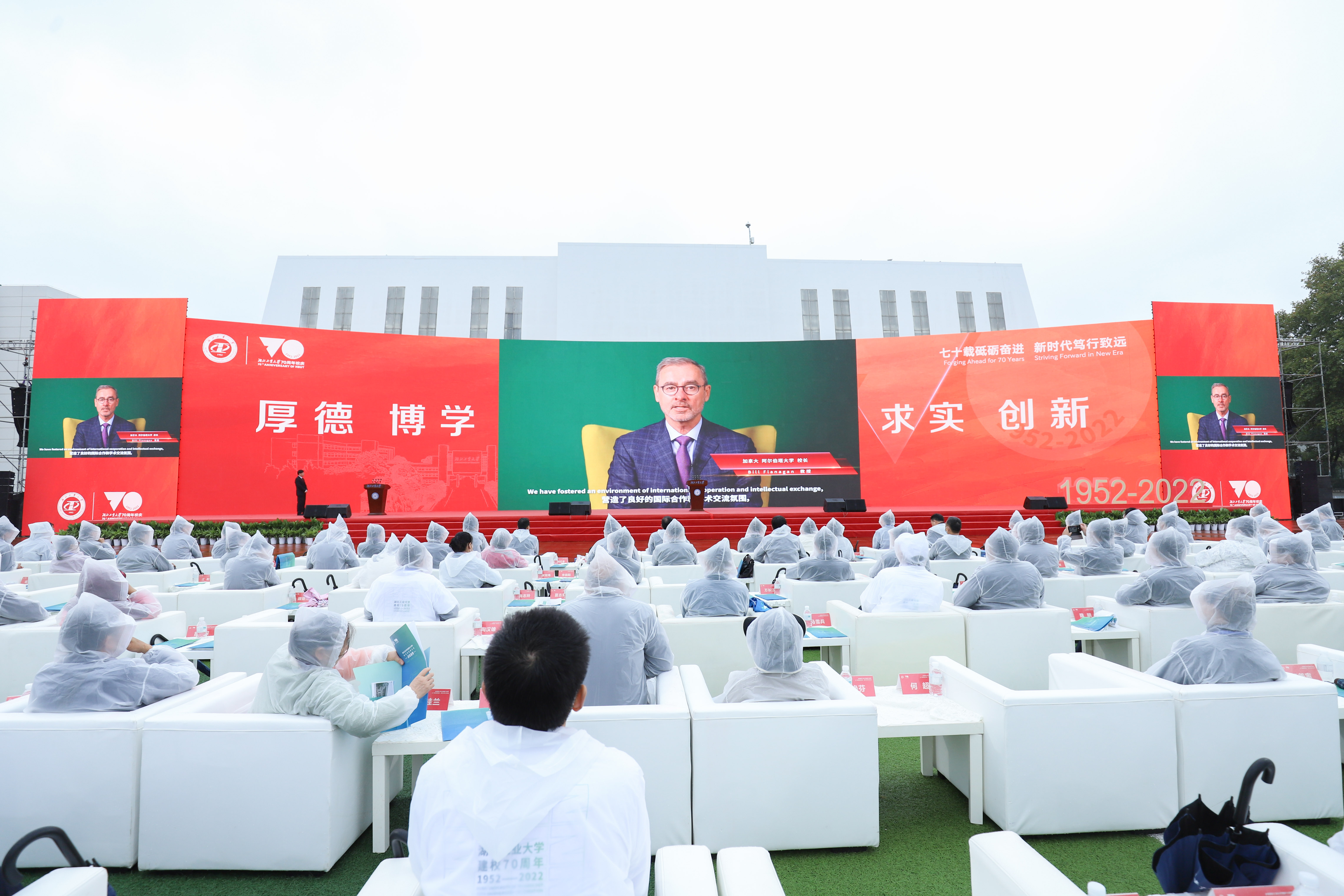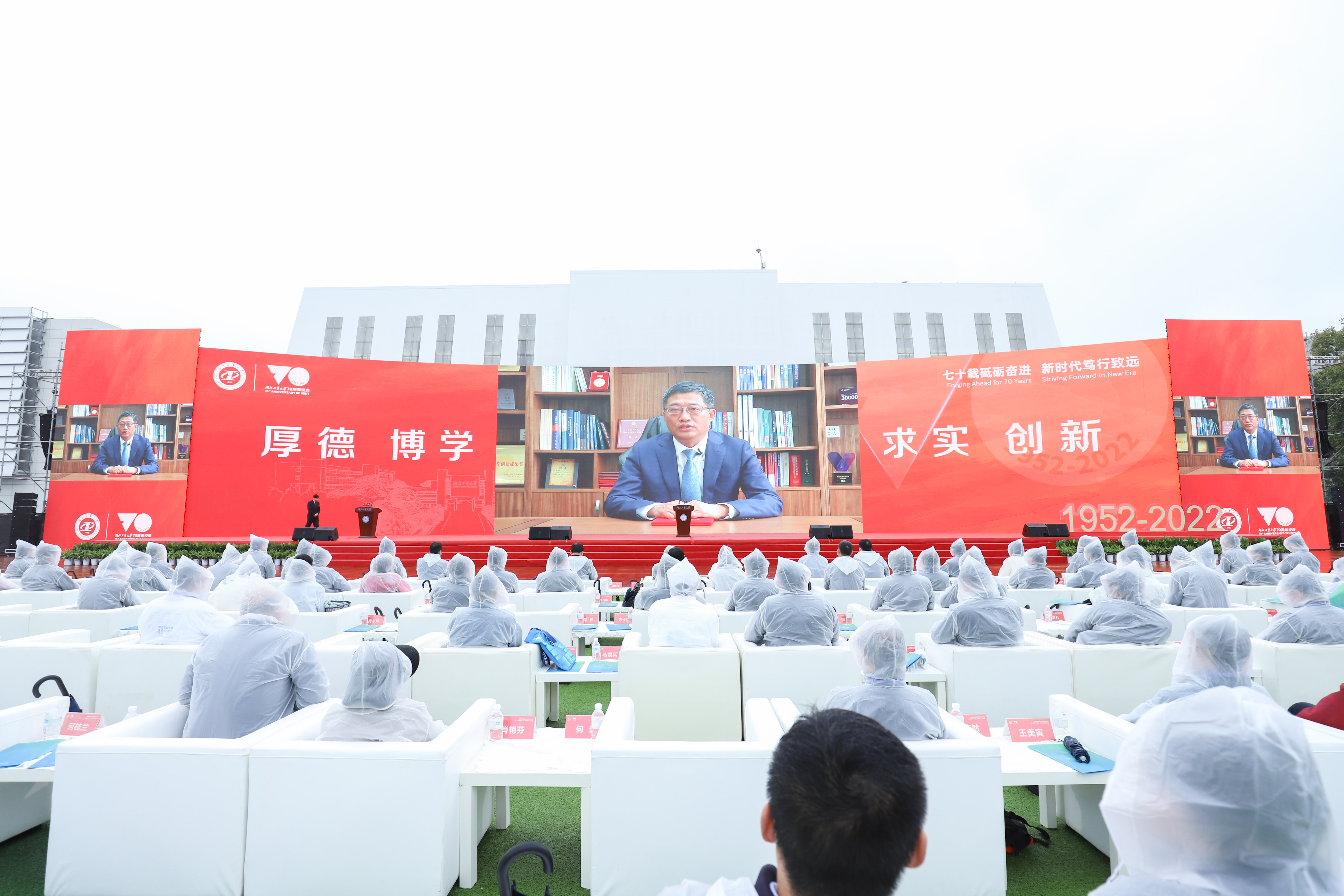 运动场上,中国红营造出端庄典雅、喜庆隆重的氛围,醒目的校庆标识装点着盛会荣光。主席台前的大屏幕上,“七十载砥砺奋进,新时代笃行致远”的校庆标语鲜艳夺目。体育场四周飘扬着18条红色标语,“七十载传承工业文明,新时代谱写绿色华章”“铭初心奋进荆楚七十载,创一流建功祖国新时代”等口号振奋人心。上午10点整,庆祝大会在雄壮的国歌声中启幕。